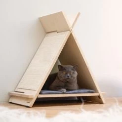 Ein schöner Platz zum Relaxen für Ihre Katze im Mittelpunkt des Wohnzimmers? Das ist möglich mit dem Beeztees Kratzmöbel Holz Rinty. Das Design lehnt sich an den Charakter uralter Tipi-Zelte an und nimmt gleichzeitig moderne Trends mit auf. An den Seitenwänden des Möbelstücks befinden sich robuste Sisalmatten, die zu ausgiebigen Kratzsessions einladen. Auf dem weichen Kissen, das sich zwischen die Kratzbretter schmiegt, kann die Katze herrlich schlafen.
