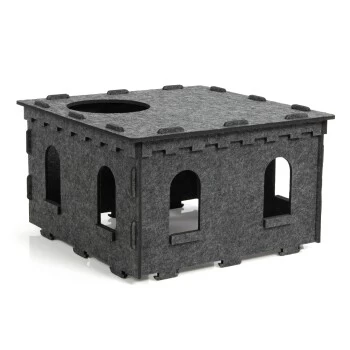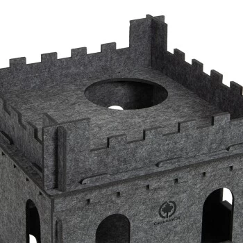 Das mit Filz-Zinnen umrandete Dach bietet der Katze die beste Aussichtsmöglichkeit, auf welchem sie in optimaler Höhe Ihr gesamtes Reich im Auge behalten und Neuankömmlinge früh erspähen kann. Ein natürlicher Lichteinfall in das Innere der Burg ist durch die großzügigen Fenster auf allen Etagen gewährleistet. Die Fenster sind groß genug, um dadurch z. B. nach einer Katzen Spielangel zu greifen oder andere Spielzeuge zu fangen.