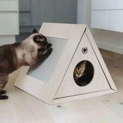 Das Triangle House ist in wenigen Minuten zusammengebaut. Der großzügige Eingang bietet Ihrem Stubentiger Zugang zu einem Rückzugsort wo es sich Schlummern und Relaxen lässt.