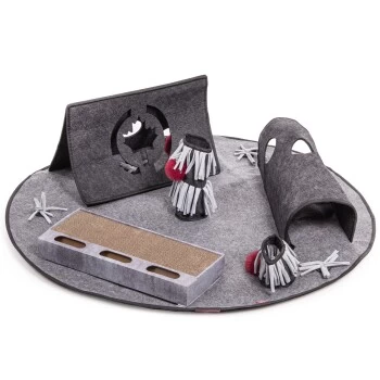 In jedem Tunnel, Turm oder Versteck des Teppichs sind Löcher, sodass Deine Katze mit der Pfote hindurchkommen und die integrierten Spielbüschel inklusive Glöckchen einfangen kann. Außerdem verfügt der Spielteppich COSMO über eine praktische Kratzfläche, auf der Deine Katze ihre Krallen wetzen und pflegen kann. Die Kratzpappe besitzt eine Spielschiene mit einem Ball inklusive Glöckchen, der zum Spielen animiert. Die Spielschiene wird mit durch ein eingenähtes Klettband am Teppich angebracht und kann bei Bedarf auch einzeln verwendet werden. Falls die Kratzpappe einmal ausgetauscht werden muss, bietet CanadianCat auch das passende Ersatzteil.
