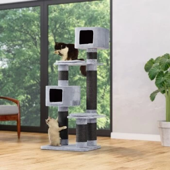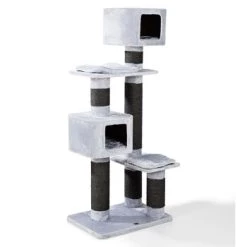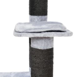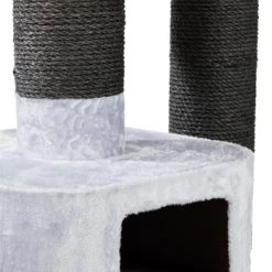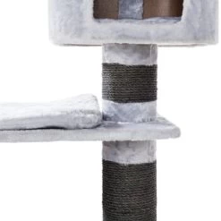 Der Kratzbaum hat fünf Ebenen, die komlett mit Plüsch überzogen sind. Er hat zwei Höhlen, die mit einem Plüschkissen ausgestattet sind, und zwei Liegebretter, die ebenfalls mit einem Plüschkissen ausgelegt sind. Alle Kissen werden mittels Klettband an den Liegebrettern und in den Höhlen befestigt. Die Kratzstämme haben einen Durchmesser von 14cm und sind mit robustem, natürlichen Sisal umwickelt und verklebt. An den Enden sind diese mit Plüsch unrandet.