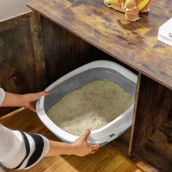 [Stilvolles Katzenklo] Mit seinem rustikalen Stil und den schicken Scheunentüren fügt sich dieses Katzenklo problemlos in die meisten Wohnstile ein und verwandelt das stille Örtchen Ihrer Katze in einen echten Blickfänger [Mehr Privatsphäre, weniger Geruch] Dank der geschlossenen Konstruktion bietet diese Katzentoilette einen privaten Ort, an dem sich Ihre Katze sicher fühlt, um ihre Notdurft zu verrichten und es entsteht weniger Schmutz – eine Win-Win-Lösung! [Geräumiger Innenraum] Mit einer Größe von 50 x 50 x 46 cm bietet das Hauptfach dieses Katzenschranks genug Platz für die meisten Katzentoiletten. Sie können auch die Trennwand entfernen, um die Fläche auf 74,9 x 50 x 46 cm zu vergrößern [Für Ihre Katze und Sie] Stellen Sie ein Katzenklo hinein, verwenden Sie es als Beistelltisch oder stellen Sie ein Katzenbett hinein, um einen gemütlichen Unterschlupf zu schaffen [Kinderleichte Montage] Ihre Katze kann es kaum erwarten, ihr neues Möbelstück auszuprobieren? Kein Problem, denn mit einer Schritt-für-Schritt-Anleitung und beschrifteten Teilen ist dieses Katzenhaus in 20 Minuten fertigFeandrea Hinweise:
