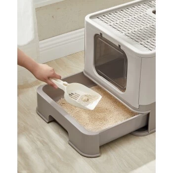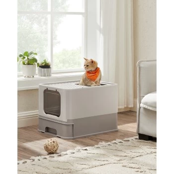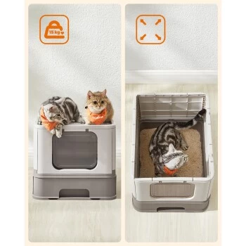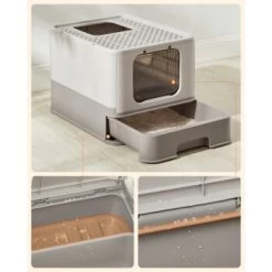 [Leicht zu entleeren & reinigen] Mit einer ausziehbaren Schublade lässt sich das Katzenklo leicht entleeren und mit neuer Streu füllen. Mitgelieferte Schaufel und Bürste helfen, den Abfall zu schaufeln und die Streu oben oder in den Ecken zu reinigen [Weniger Schmutz] Das Gitter-Design oben verringert die Spurenbildung und lässt die Streu zurück in die Box fallen. Dadurch wird die Spurenbildung im Haus reduziert und Ihr Zuhause bleibt sauber [Kein Auslaufen] Der verlängerte Rand oberhalb der Box und ein geschlossener Boden darunter verhindern, dass Streu oder Katzenurin auf den Boden gelangen. Ein praktischer Helfer, wenn Ihre Katze gerne gräbt oder steht, um zu pinkeln! [Perfekt für große und dicke Katzen] Die Innengröße der Katzentoilette beträgt 50 x 40,5 x 34,5 cm und bietet somit viel Platz für große Katzen. Wie sieht es mit der Oberfläche aus? Keine Sorge, sie kann bis zu 15 kg tragen [1 Tür, 2 Konfigurationen] Die Tür lässt sich so einstellen, dass sie nur einseitig aufgeht und die obere Öffnung als Ausgang genutzt werden kann. Auch ein beidseitiges Öffnen der Tür lässt sich einstellen – je nach Bedarf. Wenn Ihre Katze ein Anfänger ist, können Sie die Tür auch entfernen [Kein Werkzeug erforderlich] Dank des Klapp-Designs und der leicht verständlichen Anleitung ist das neue Katzenmöbel Ihres Freundes in 5 Minuten oder weniger fertig!Feandrea Hinweise: