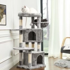 Haben Sie Angst, dass Ihr Kätzchen nicht auf diesen Kratzbaum klettern kann? Keine Sorge! Dank des treppenartigen Layouts schafft es jede Katze bis zur Aussichtsplattform