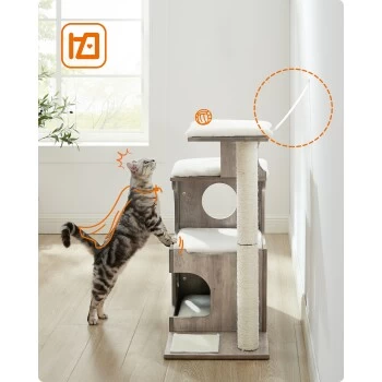 Für mehr Spaß: Auf einer der großzügigen Plattformen des Katzenhäuschens oder in der geräumigen Katzenhöhle? Egal für welchen Ort sich Ihre Katze entscheidet, der Katzenbaum bietet durch die stabilen MDF-Platten überall stets höchste Stabilität