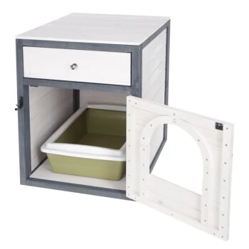 Der formschöne Schrank von Kerbl verfügt über eine praktische Schublade für Zubehör und eine Tür mit Eingang für Ihren Stubentiger. In den Schrank kann auch eine Katzentoilette oder ein Liegekissen integriert werden, damit Ihre Katze den perfekten Rückzugsort hat.