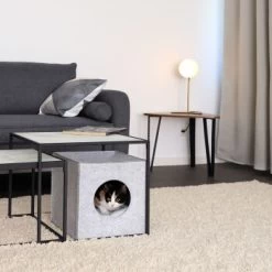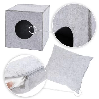 Wenn du an einer Alternative für die gängigen Katzenbetten interessiert bist, ist die lionto Katzenhöhle eine ideale Lösung. Die würfelförmige Kuschelhöhle aus warmem und stabilem Filz beinhaltet einen Eingang mit einem Durchmesser von 17 cm und einer Wanddicke von 5 mm. So kann der faltbare Katzenwürfel ohne Bedenken als Katzenbettchen und Rückzugsort genutzt werden und vermittelt deiner Katze ein sicheres Gefühl und Wohlbehagen. Die Maße betragen 33x37x33 cm und somit ist diese Filzhöhle für einige gängige Regale wie beispielsweise dem Ikea Kallax oder Ikea Expedit Regal geeignet. Wenn du die Höhle in ein passendes Regal stellst, werden besonders Katzen, die sich gerne zurückziehen, voll auf ihre Kosten kommen. Natürlich macht die Katzenhöhle auch freistehend etwas her und bietet immer einen gemütlichen Schlafplatz. Wir bieten diesen Filzwürfel in den Farben hellgrau und dunkelgrau und wahlweise mit einem weichen Liegekissen oder ohne Kissen an. Der Bezug des Liegekissens kann zur Reinigung abgenommen werden.