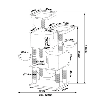 - Maße UND FARBEN. Dieses hochwertige Katzenzubehör verfügt über die Maße 60 x 45 x 145 cm, die Höhlen über 38 x 38 x 25 cm und das Plateau 35 x 35 cm. Das langlebige Spielzeug ist in der Farbe hellgrau und dunkelgrau erhältlich.
