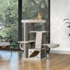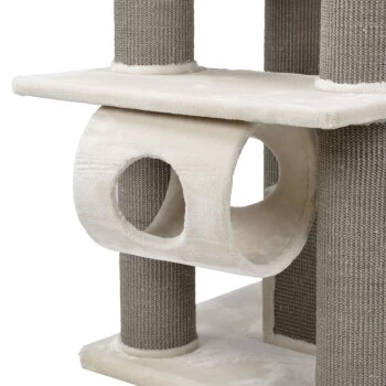 Der MORE Kratzbaum Anne vereint Design und Funktionalitäten in einer hochwertigen und modernen Bauweise. Vier unterschiedliche Ebenen laden zum ausgiebigen Entdecken und Klettern ein, während das robuste Sisal dem täglichen Kratzbedürfnis Ihrer Samtpfote entgegenkommt. Mehrere großzügige kuschelige Liegeflächen bieten ideale Voraussetzungen zum Entspannen und Beobachten. Die Kletterleiter lädt zum Bewegen und Erkunden ein, während die Hängematte den Spieltrieb weckt. Selbst größere Katzen finden mit dem stabilen MORE Kratzbaum Anne ausreichend Platz zum Kratzen, Entspannen und Spielen.