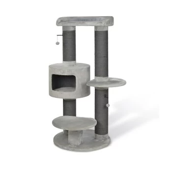 Der robuste Kratzbaum Henry hat eine besonders stabile Bodenplatte, die für einen sicheren Stand sorgt. Drei verschieden große Liegeflächen und eine kuschelige Höhle laden zum verweilen auf unterschiedlichen Ebenen ein. Vier hohe Sisalsäulen für den Kratztrieb und zwei kleine Spielbälle runden den Bedarf deiner Katze ab.
