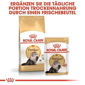 Um den individuellen Vorlieben jeder Katze gerecht zu werden, ist ROYAL CANIN Persian Adult auch als Nassfutter in Form einer weichen Mousse erhältlich. Wenn Sie eine Mischfütterung in Betracht ziehen, befolgen Sie einfach unsere Empfehlungen zur Fütterung, um sicherzustellen, dass Ihre Katze die richtige Menge an Nass- und Trockenfutter erhält.