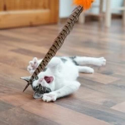Bitte beachte: Die Lebensdauer der Federwedel ist begrenzt. Je mach Temperament der Katze brechen die Federn früher oder später. Dann ist es Zeit für einen neuen Federstab.
