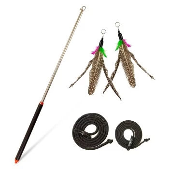 Die im Lieferumfang enthaltenen Federn und Bänder werden den Jagdinstinkt deiner Katze wecken. Unsere Federanhänger drehen sich um ihre eigene Achse, während sie durch die Luft fliegen und imitieren somit einen Vogel – die wohl liebste Beute der Katze. Die Anhänger können dank Karabinerhaken einfach und schnell ausgetauscht werden. Du kannst dieses Katzenspielzeug so optimal an die Vorlieben und BedĂĽrfnisse deiner Katze anpassen. Deine Katze spielt zum Beispiel gerne mit Paketband oder SchnĂĽrsenkeln? Kein Problem – auch diese können blitzschnell an der Teleskopangel angebracht werden!