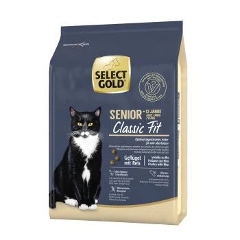 „SELECT GOLD Senior +12 Geflügel mit Reis ist eine speziell entwickelte, ausgewogene Premium-Trockennahrung – Alleinfuttermittel für sehr alte Katzen ab dem ca. 12. Lebensjahr. Diese qualitativ hochwertige Trockennahrung mit weizenfreier Rezeptur wird unter Verwendung von schmackhaftem Hühnerfrischfleisch hergestellt und eignet sich durch die spezielle Zusammensetzung besonders für sehr alte Katzen ab dem ca. 12. Lebensjahr. Bei der Entwicklung dieser Premium-Rezeptur wurden die ernährungsphysiologischen Anforderungen von sehr alten Katzen gezielt berücksichtigt.