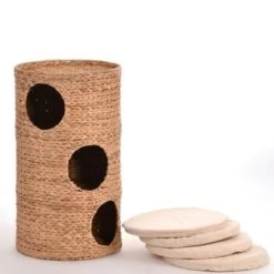 KletterspaĂ und RĂŒckzugsmöglickeit bieten Sie Ihrem Liebling mit dieser Katzentonne. Das weiche Geflecht aus Wasserhyazinte fĂŒgt sich harmonisch in jedes Wohnambiente ein. FĂŒr besondere GemĂŒtlichkeit sorgen die vier weichen Kissen, die sich jeweils in den drei Höhlen und auf dem Dach befinden (herausnehm- und waschbar).