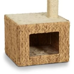 Die Höhle (ca. 36x36x28cm) und die Liegemulde (Ă 40cm) sind aus einem stabilen Metallgestell hergestellt, welches mit weicher Wasserhyazinthe verflochten ist. Der Kratzbaum ist der perfekte RĂŒckzugsort fĂŒr Ihren Stubentiger. Der mit Natursisal umwickelte Kratzholm dient der Krallenpflege.