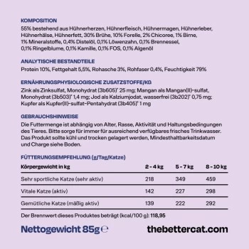 - 🇩🇪 Hergestellt in Deutschland mit regional heimischen Zutaten und Kräutern wie Löwenzahn, Brennnessel und Distelöl für die mäkeligsten Katzen