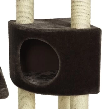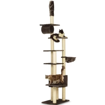 Der deckenhohe Kratzbaum Madrid ist in der Höhe von 245 bis 270 cm verstellbar. Eine komplett mit Fleece ausgestattete Höhle, vier mit Plüsch bezogene Liegeplatten, zwei Liegemulden, eine Spielrolle und hohe, mit Natursisal umwickelte Stämme sorgen für viel Abwechslung.